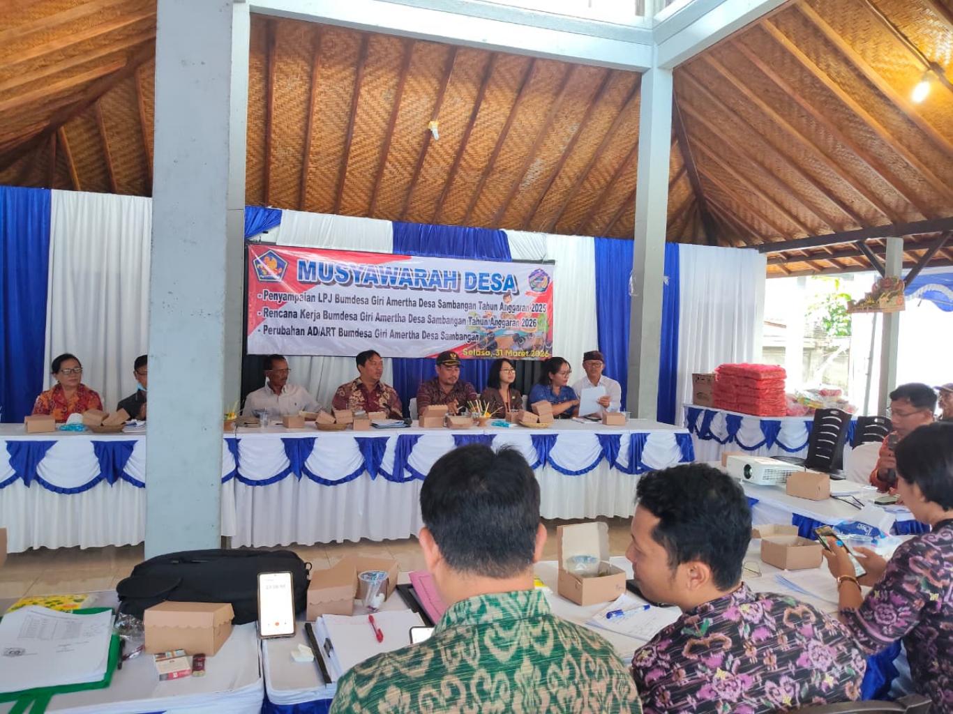 Badan Permusyawaratan Desa (BPD) Desa Sambangan menyelenggarakan Musyawarah Desa yang berlangsung di Bale Subak Sambangan pada Selasa (31/3/2026) pukul 09.30 WITA. Kegiatan ini difasilitasi oleh Pemerintah Desa Sambangan dan dihadiri oleh unsur Dinas PMDPPKB, Camat Sukasada, Perbekel serta Perangkat Desa Sambangan, LPM Desa Sambangan, Direktur BUMDesa beserta staf, Dewan Pengawas BUMDesa Giri Amertha, Pendamping Desa serta perwakilan masyarakat.